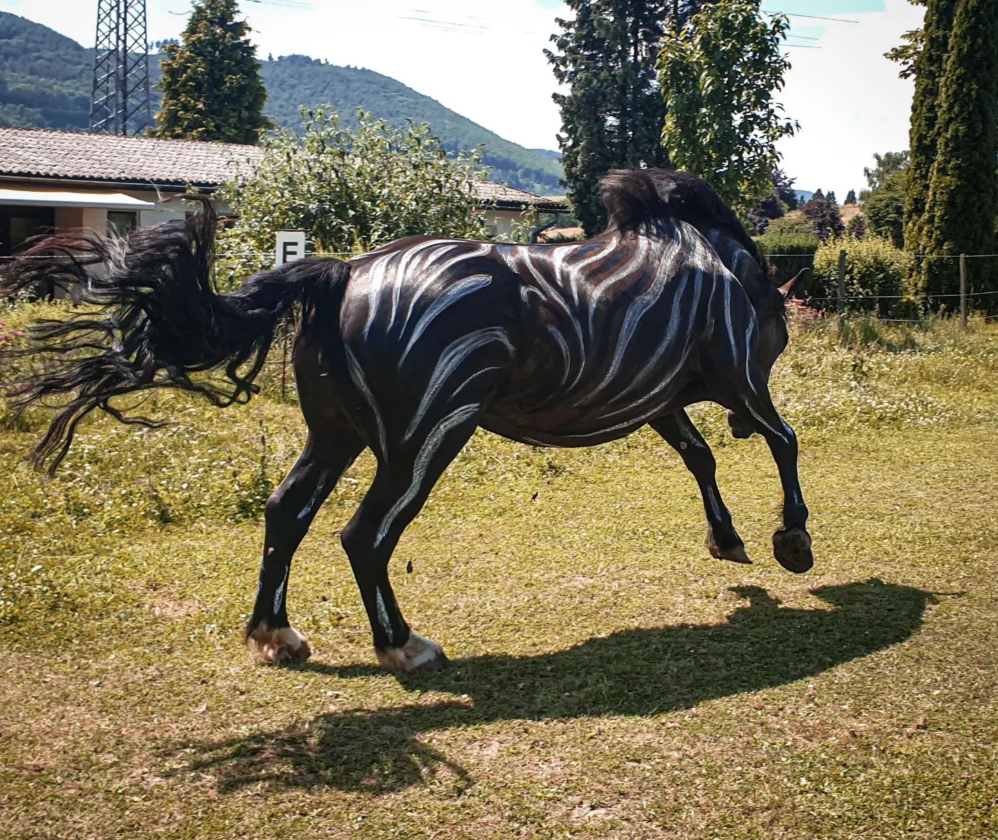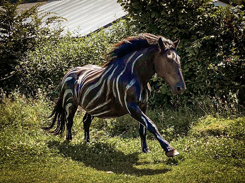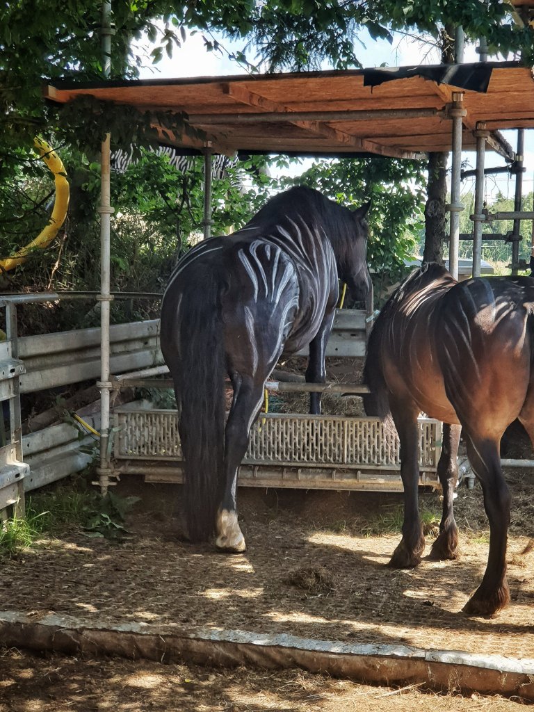 und ich muss sagen…. ich hab’s ja eigentlich nicht wirklich geglaubt, aber die Insekten sind echt irgendwie irritiert davon … selbst die dicken Pferdebremsen fliegen zwar um das Pferd herum, trauen sich aber nicht so wirklich, sich drauf zu setzen… und wenn sie dann doch ne streifenfreie Stelle gefunden haben und das Pferd dann aber zuckt, fliegen die wieder weg… wie, als wäre denen das nicht so ganz geheuer… 🤷♀️🙂👍🏻